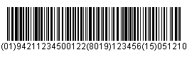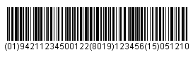 ![]() | (01)94211234500122(8019)123456~(15)051210 0194211234500122801912345615051210 |